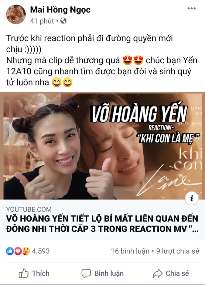 Mới đây, Võ Hoàng Yến tiếp tục cho ra mắt đoạn clip mới thuộc series reaction MV của mình, và sản phẩm lên sóng lần này chính là Khi con là mẹ của Đông Nhi. Không chỉ reaction thông thường, Võ Hoàng Yến còn lần đầu tiết lộ một bí mật “động trời” về mối quan hệ của mình với Đông Nhi mà ít ai biết.
