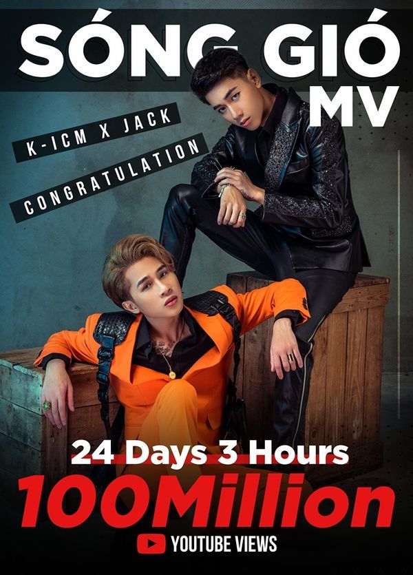 Sau đúng hơn 24 ngày 3 giờ lên sóng, MV Sóng gió từ cặp đô Jack và K-ICM ra mắt ngày 12/7 đã chính thức cán mốc 100 triệu views cùng hơn 1,5 triệu lượt thích trên Youtube. Cũng với thành tích nhanh một cách “chóng mặt” này, MV Sóng gió của Jack và K-ICM chính thức vượt qua sản phẩm Người lạ ơi (Orange, Karrik - 38 ngày) trong danh sách những MV đạt kỷ lục về thời gian cán mốc 100 triệu views Vpop.