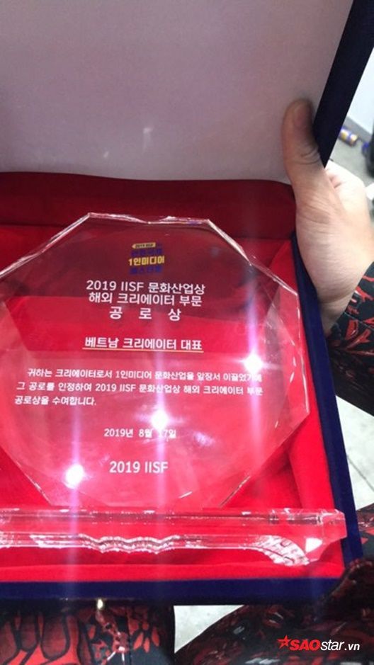 Trong chuyến công tác tại Hàn Quốc vừa qua, không chỉ tham gia sự kiện âm nhạc với tư cách là đại diện Việt Nam mà Jack và K-ICM còn xuất sắc “rinh” về giải thưởng Thành tựu Công Nghiệp Văn hóa Incheon International Single-Media Festival (IISF 2019) do phía Hàn Quốc trao tặng. Theo đó, đây là Giải thưởng thành tựu dành cho nghệ sĩ nước ngoài và cụ thể là một trong những đại diện sáng tạo của Việt Nam đã có những cống hiến, dẫn đầu văn hóa truyền thông.