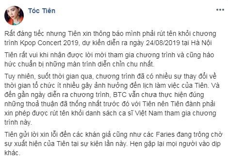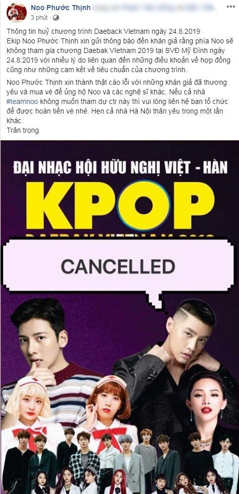 Tóc Tiên, Noo Phước Thịnh và loạt nghệ sĩ Hàn đồng loạt thông báo hủy đêm nhạc Kpop tại Hà Nội vào 24/8