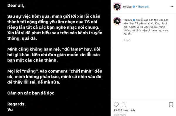 Lời xin lỗi của Thái Vũ.