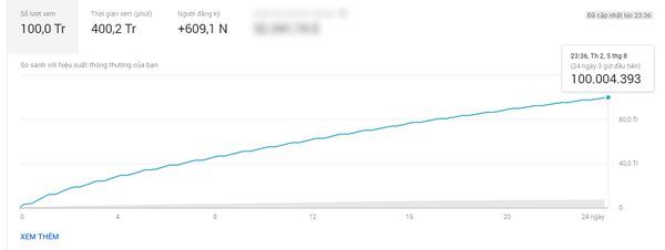 Biểu đồ cho thấy đúng sau 24 ngày và 3 giờ, MV Sóng gió chạm mốc 100 triệu views.