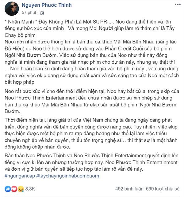 Không chỉ dừng lại ở việc đăng đàn trên trang cá nhân, mới đây, quản lý của Noo Phước Thịnh đã ủy quyền cho luật sư gửi văn bản “Cảnh báo quyền tác giả, quyền liên quan” đến Nhà sản xuất bộ phim Ngôi nhà bươm bướm. Theo đó, phía Noo Phước Thịnh tố cáo rõ trong văn bản về những hành vi vi phạm quyền liên quan đến quyền tác giả đối của đoàn làm phim với Bản ghi âm này: