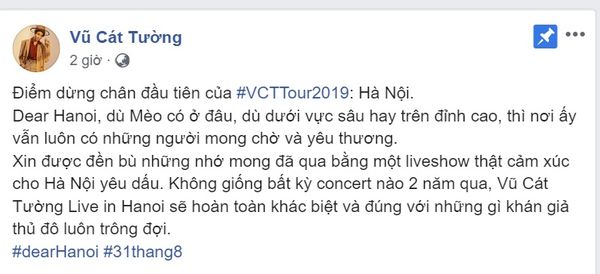 Sau khi công bố về dự án mang tên VCT Tour 2019, mới đây Vũ Cát Tường đã đăng tải hình ảnh kèm lời nhắn trên trang cá nhân, chính thức tiết lộ địa điểm đầu tiên tổ chức VCT Tour 2019 chính là Hà Nội. Nữ ca sĩ chia sẻ thêm: “Dear Hanoi, dù Mèo có ở đâu, dù dưới vực sâu hay trên đỉnh cao, thì nơi ấy vẫn luôn có những người mong chờ và yêu thương. Xin được đền bù những nhớ mong đã qua bằng một liveshow thật cảm xúc cho Hà Nội yêu dấu. Không giống bất kỳ concert nào 2 năm qua, Vũ Cát Tường Live in Hanoi sẽ hoàn toàn khác biệt và đúng với những gì khán giả thủ đô luôn trông đợi”.