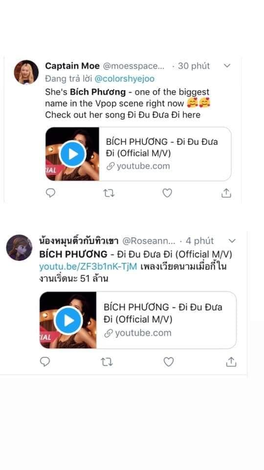 Tuy nhiên điều khiến khán giả Việt tự hào nhất chính là hậu sân khấu Đi đu đưa đi, Bích Phương bỗng chốc trở thành cái tên được khán giả nước ngoài “truy lùng” ráo riết. Đa phần đều không giấu được sự thích thú dành cho nhan sắc xinh đẹp của Bích Phương cũng như thần thái nữ quyền, sang chảnh trong lúc trình diễn bản hit Đi đu đưa đi.