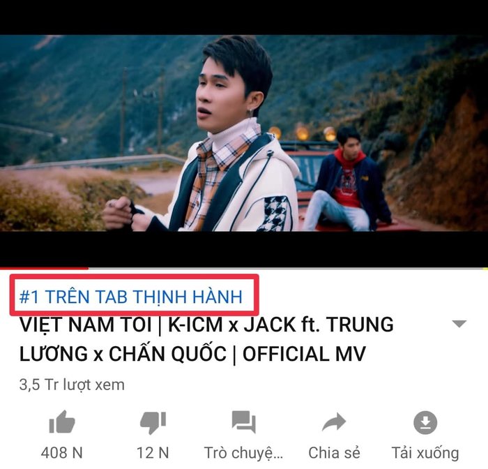 Trong khi người hâm mộ vẫn còn chưa kịp “cày cuốc” MV này được nhiều thì mới đây, Việt Nam Tôi đã phi thẳng lên #1 trending Youtube trong vòng chưa đầy 1 ngày ra mắt với hơn 3.5 triệu lượt xem. Thành tích này một lần nữa khẳng định được sức hút mà bộ đôi này đang có thật sự quá khủng. Thời điểm ra mắt, một vài ý kiến cho rằng vì Việt Nam Tôi là một ca khúc hát về quê hương, đất nước nên sẽ khá “lì”, tuy nhiên với thành tích hiện tại thì hoàn toàn có thể khẳng định rằng K-ICM và Jack là bộ đôi bảo chứng top trending mạnh nhất thời điểm này.