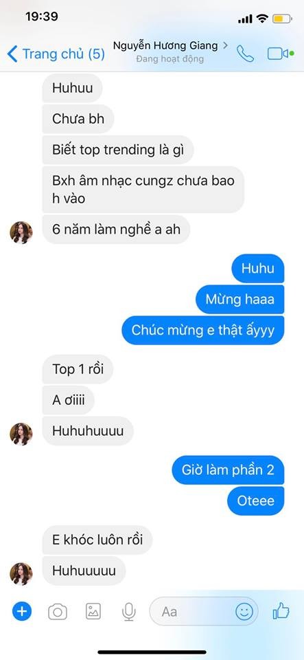 Với thành tích này, không ngạc nhiên khi Hương Giang đã vô cùng xúc động và có những lời chia sẻ cùng người bạn của mình. Theo đó nữ ca sĩ cho biết đã trải qua 6 năm làm nghề nhưng cho đến bây giờ cô mới biết top 1 trending là như thế nào. Đây chắc chắn là niềm vui cũng như niềm hạnh phúc quá đỗi tự hào khi “đứa con tinh thần” đạt được thành tích quá lớn thế này khiến Hương Giang đã không khỏi bật khóc.