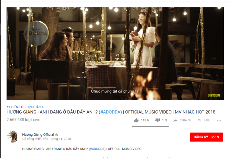 Anh đang ở đâu đấy anh - một sản phẩm comeback của Hương Giang ngay từ khi lên sóng đã như một “cơn sốt” gây sự quan tâm của khán giả. Đây là MV có độ dài hơn 11 phút với mô tuýp “người thứ 3” đưa người xem đi qua nhiều cung bậc cảm xúc và cuốn vào mạch cảm xúc của câu chuyện. Sau ít ngày ra mắt, MV nhanh chóng leo lên vị trí “ngôi vương” khi xuất sắc đạt top 1 trending trên YouTube.