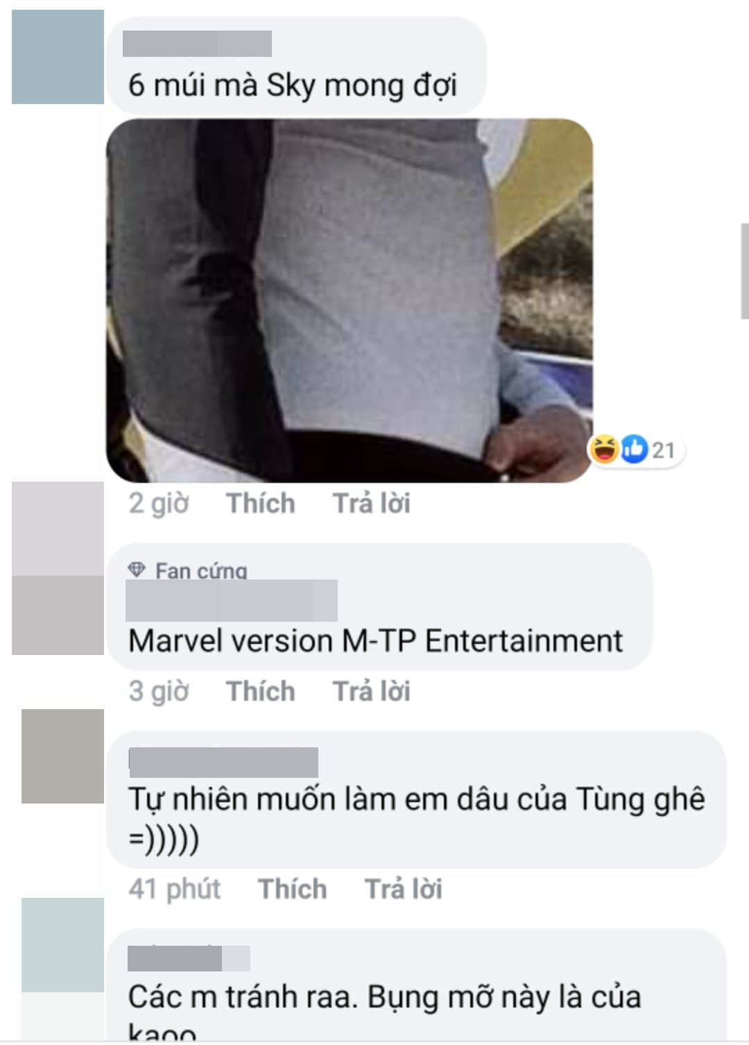 Fan của Sơn Tùng M-TP không biết đã mò mẫm, tìm tòi cách nào đó để “hô biến” cho nam ca sĩ trở nên cuồn cuộn 6 múi một cách bất ngờ. Tuy nhiên, có lẽ do quá vội vàng hay lỡ tay mà kết quả cuối cùng, phần múi bụng lại nằm chồng lên cả lớp áo lồ lộ ra ngoài khiến ai nhìn xem cũng phải nín lặng. Không biết Sơn Tùng M-TP nếu như có cơ hội được xem những thành quả ấn tượng từ người hâm mộ thì anh chàng sẽ khóc hay cười đây?