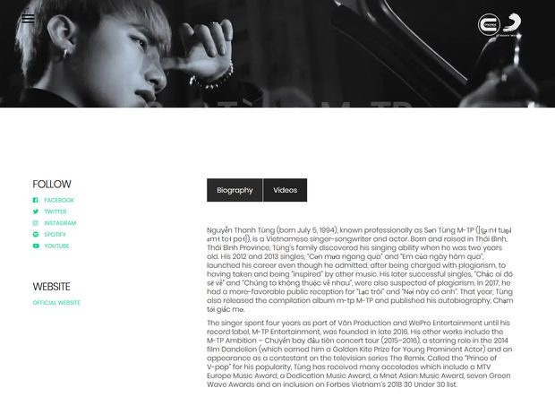 Chưa hết, hình ảnh của Sơn Tùng M-TP còn được xuất hiện trong danh sách những nghệ sĩ của hãng thu âm như: John Preston, Greg Marks, Petey Pablo,… Cùng với đó là phần thông tin tiểu sử vô cùng chi tiết khi ghi lại rất nhiều những cột mốc đáng nhớ của nam ca sĩ.