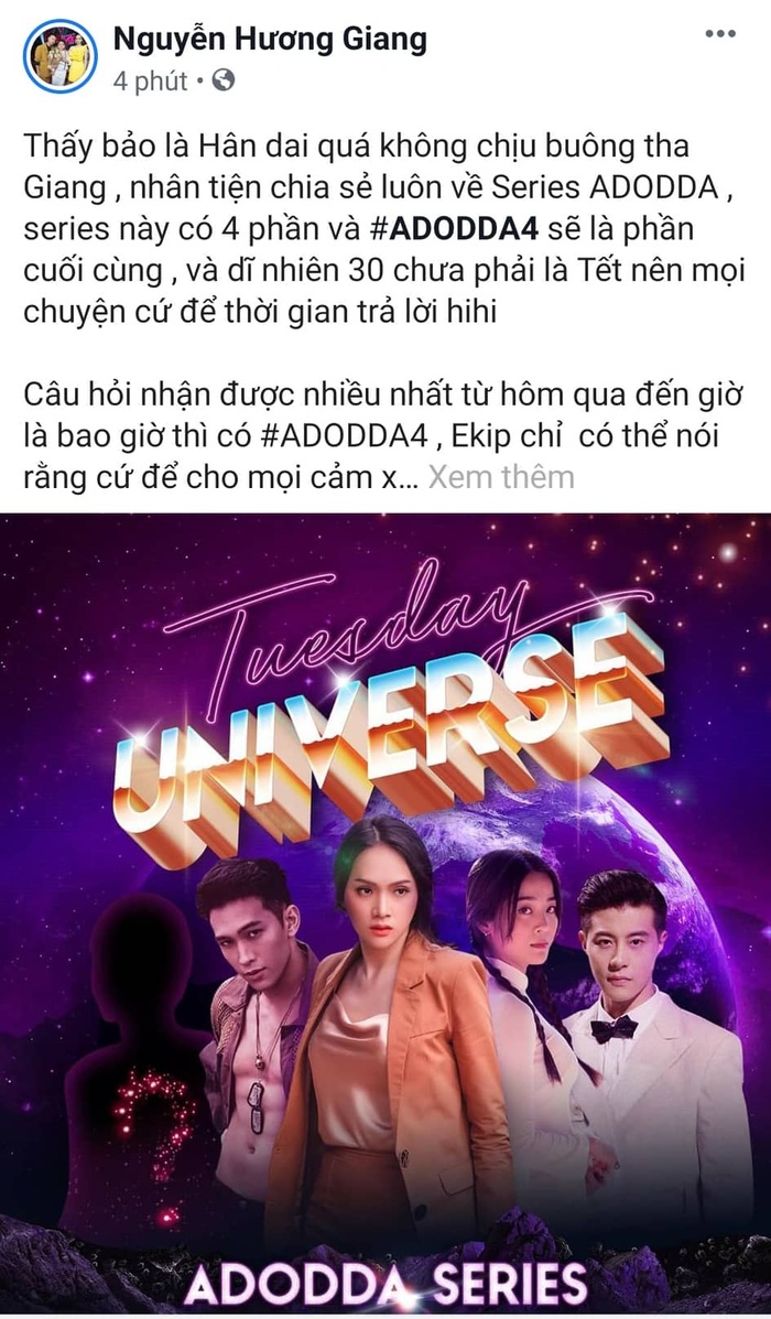 Hương Giang mới đây tiếp tục khiến khán giả và người hâm mộ vô cùng tò mò khi tung ra những hình ảnh tiếp theo cho vũ trụ Tuesday. Theo đó, Hương Giang cho biết vì mọi người phản hồi quá nhiều về việc Hân “sống dai” quá nên quyết định bật mí #ADODDA4 sẽ là phần cuối cùng của chuỗi series này.