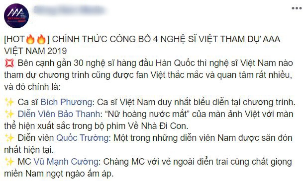 Vừa qua, ban tổ chức lễ trao giải Asia Artist Awards 2019 (AAA 2019) đã chính thức công bố dàn line up nghệ sĩ Hàn sẽ có mặt tham dự tại Việt Nam. Bên cạnh những ngôi sao KPop đình đám, mới đây, BTC lễ trao giải AAA 2019 đã công bố thêm danh sách nghệ sĩ Việt tham gia có mặt tại chương trình gồm những cái tên vô cùng nổi bật.