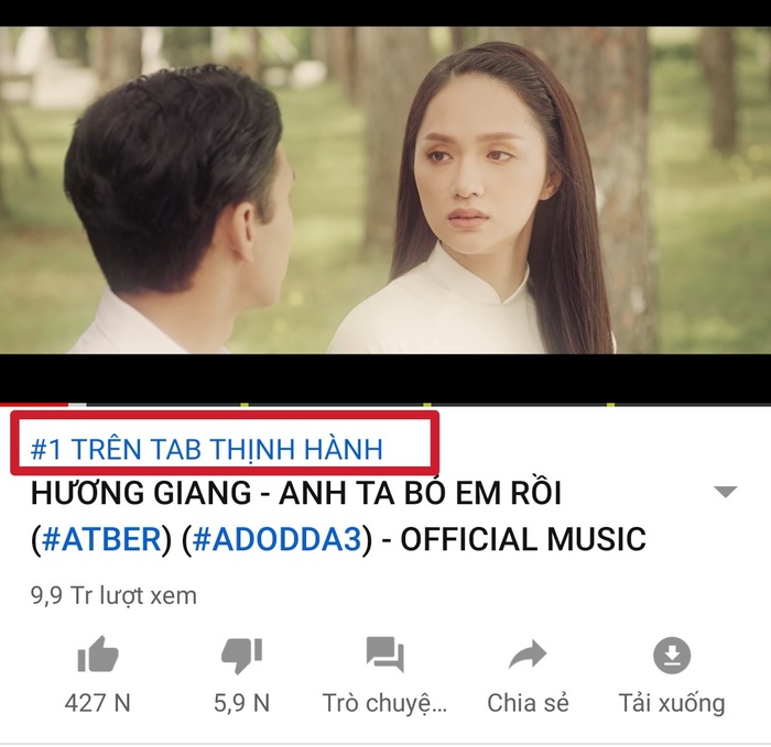Dù sản phẩm âm nhạc trở lại của Hương Giang có khá nhiều ý kiến trái chiều vì còn đâu đó sự hụt hẫng của khán giả, tuy nhiên, về tổng thể, Anh ta bỏ em rồi vẫn là một MV đáng xem và đáng chờ đợi. Chỉ sau chưa đầy 2 ngày lên sóng, MV Anh ta bỏ em rồi của Hương Giang đã chính thức “hạ bệ” Tự tâm - Nguyễn Trần Trung Quân để dẫn đầu top trending Youtube Việt Nam. Thành tích ấn tượng này của Hương Giang một lần nữa minh chứng cho sức hút khủng của nữ ca sĩ cùng với series #ADODDA “đầy rẫy” những drama.