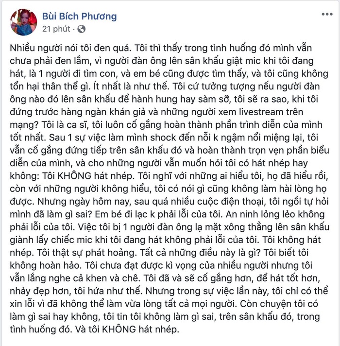 Trước những ồn ào bỗng dưng bủa vây lấy mình, mới đây, Bích Phương bất ngờ cập nhật dòng trạng thái nhất trên trang cá nhân về sự cố đáng tiếc trên vào đêm qua. Theo đó, nữ ca sĩ chia sẻ tình huống đó “chưa phải là đen lắm” vì người đàn ông trên sân khấu chỉ có mục đích tìm con gái bị lạc chứ không hề có ý đồ xấu xa. Bích Phương tâm sự cô “shock đến nỗi không ngậm nổi miệng lại” nhưng vẫn cố gắng hoàn thành phần trình diễn của mình. Cuối cùng, cô cho biết mình không hề sai và khẳng định nhiều lần rằng mình “không hát nhép” trước nhiều tranh cãi từ khán giả.