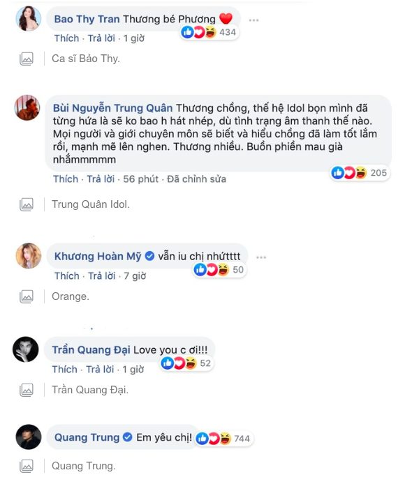 Phía dưới bài đăng, nhiều fan hâm mộ và đồng nghiệp như Trung Quân Idol, Quang Trung, Orange, Bảo Thy, Soobin Hoàng Sơn,… đều động viên và cảm thông với những dòng chia sẻ của nữ ca sĩ Đi đu đưa đi.