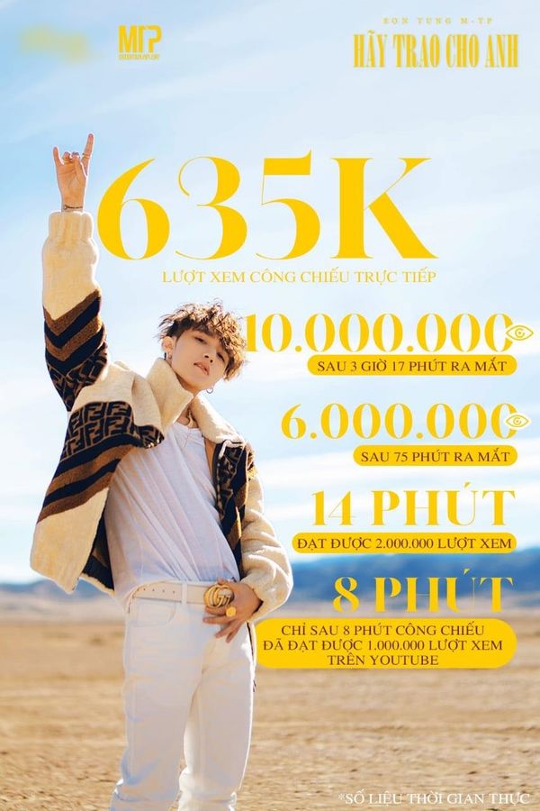 Sau hơn 1 năm ròng rã chờ đợi thì ngày 1/7 vừa qua, “phát súng” mang tên Sơn Tùng M-TP cùng MV Hãy trao cho anh đã chính thức khai hỏa. Quả không để người hâm mộ phải thất vọng, sản phẩm của Sơn Tùng nhanh chóng đạp đổ những kỷ lục trước đó của Vpop và còn ghi dấu ấn trên cả thị trường quốc tế.