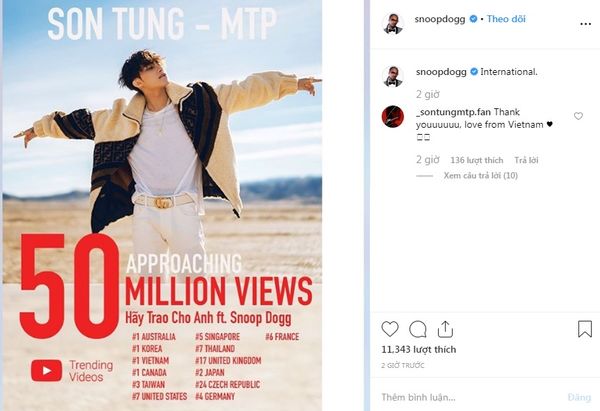 Hàng loạt thành tích “khủng” của Hãy trao cho anh được Snoop Dogg chia sẻ trên trang Instagram cá nhân ngay trong ngày sinh nhật Sơn Tùng.