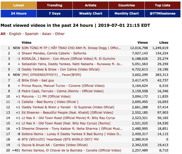 Đặc biệt ở, Sơn Tùng M-TP đã xuất sắc sở hữu MV được xem nhiều nhất thế giới trong 24h của ngày 1/7. Tính riêng ở khu vực châu lục, Sơn Tùng M-TP cũng nghiễm nhiên sở hữu MV được xem nhiều nhất Châu Á trong 24h của ngày 1/7. Bên cạnh đó, đây cũng là MV đạt 1 triệu likes nhanh nhất lịch sử Vpop (2 tiếng 59 phút), đồng thời là MV được xem lúc công chiếu đứng thứ 3 thế giới với trên 629.000 lượt xem, chỉ xếp sau Kill This Love - BlackPink và thank u, next - Ariana Grande.