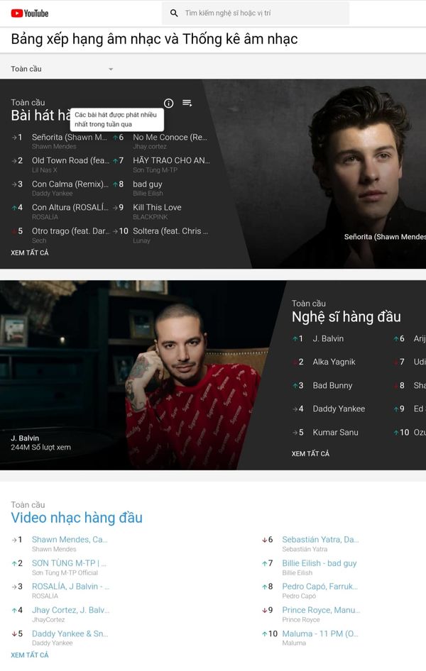 Vừa qua, Youtube đã công bố 2 BXH bài hát và MV có lượt phát nhiều nhất trong tuần trên toàn thế giới với sự góp mặt của nhiều tên tuổi đình đám của châu Á và Hollywood. Đặc biệt, Sơn Tùng chính là gương mặt duy nhất của Vpop xuất hiện trong cả hai BXH này.