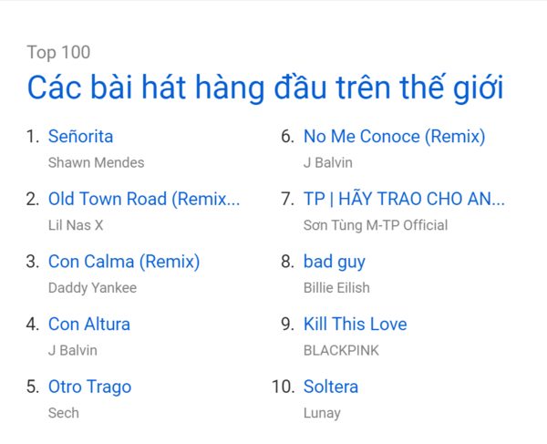 Hãy trao cho anh của Sơn Tùng đã xuất sắc vượt qua hai cái tên “đáng gờm” khác là Kill This Love (BlackPink) và Bad Guy (Billie Eilish) để xuất hiện tại vị trí thứ 7 trong top 10 bài hát được phát nhiều nhất thế giới tuần qua.