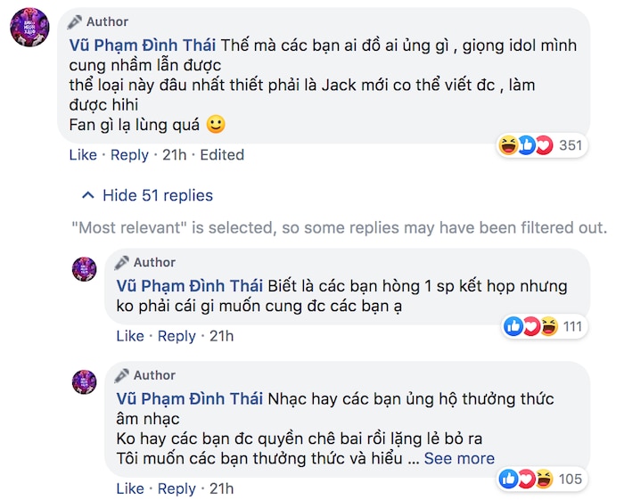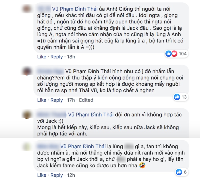 Bên dưới, đông đảo thành viên của cộng đồng Đom Đóm ngay lập tức phản pháo, cho rằng là fan thì vẫn có thể nhầm lẫn, nghe giống thì bảo là giống. Chưa kể hành động mà BlackBi like từng comment mong muốn sự kết hợp với Jack đã khiến fan Jack hiểu nhầm. Tình hình cũng trở nên khá căng thẳng khi một số fan chỉ trích nặng nề và cho rằng: “Đội ơn anh vì không hợp tác với Jack”, “lấy tên Jack kiếm fame cũng không được ưa hơn nha”,… Ngược lại, fan của Thái Vũ cũng lên tiếng bênh vực anh chàng.