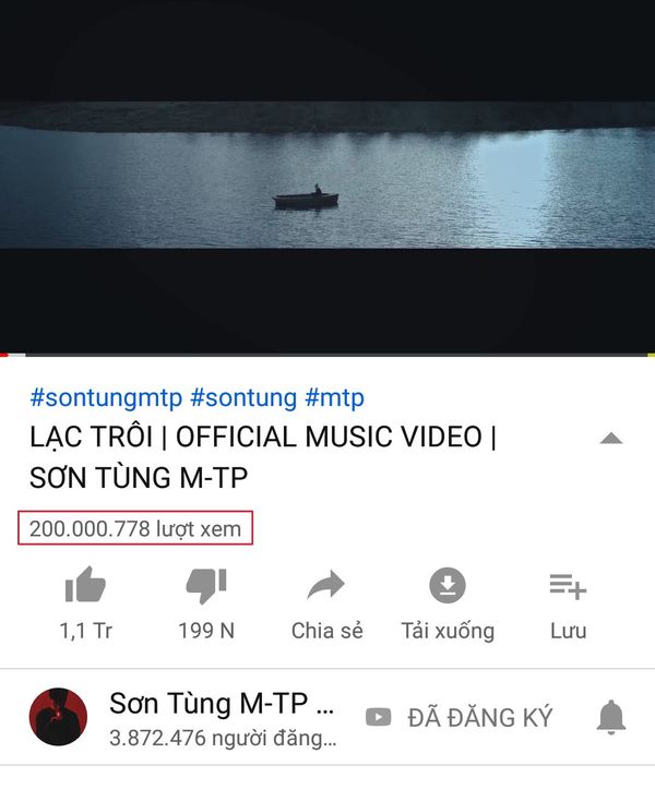 Lạc trôi của Sơn Tùng đạt 200 triệu lượt xem sau hơn hai năm ra mắt.
