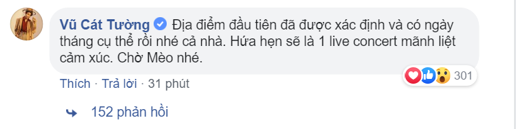 Trong phần bình luận của bài viết, Vũ Cát Tường cũng bật mí thêm:“Địa điểm đầu tiên đã được xác định và có ngày tháng cụ thể rồi nhé cả nhà. Hứa hẹn sẽ là 1 live concert mãnh liệt cảm xúc. Chờ Mèo nhé”. Điều này khẳng định ngày Vũ Cát Tường trở lại với dự án mới chắc chắn còn cách khán giả không xa.