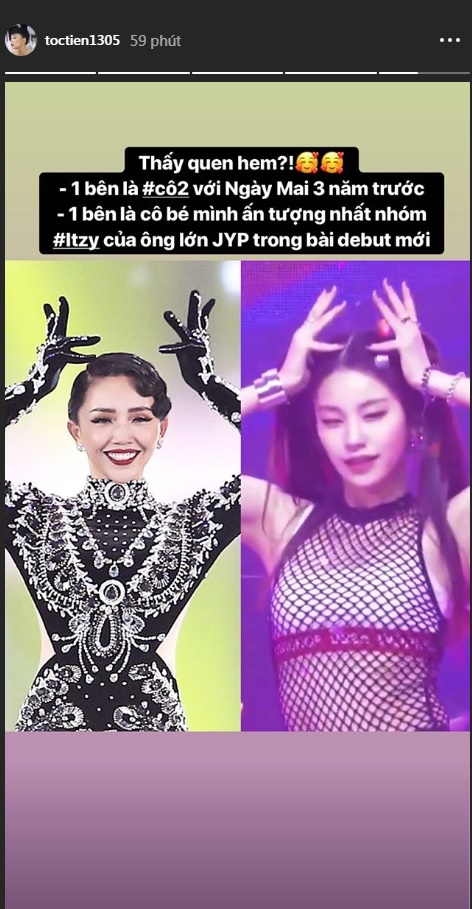 Cách đây ít phút, cộng đồng mạng tỏ ra khá thích thú với dòng chia sẻ mới nhất của Tóc Tiên. Theo đó nữ ca sĩ đã phát hiện ra một điều khá thú vị khi động tác vũ đạo kết bài trong ca khúc Ngày mai của cô được ra mắt 3 năm trước khá giống với một khoảnh khắc trong bản hit Dalla Dalla của nhóm nhạc tân binh ITZY nhà JYP. Sự trùng hợp ngẫu nhiên nhưng vô cùng đáng yêu này khiến cho người hâm mộ Tóc Tiên rất hào hứng và chia sẻ trên các trang mạng xã hội.