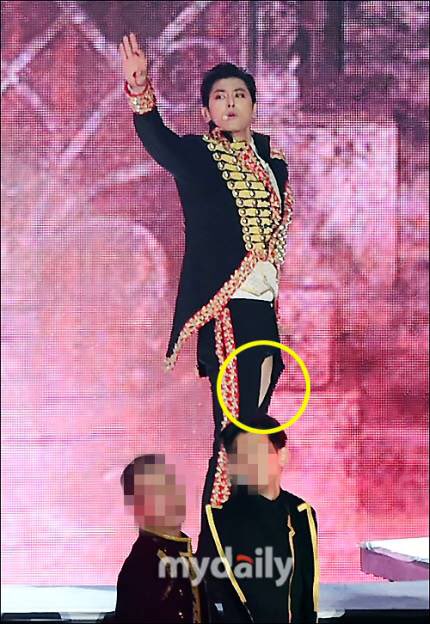 Sau khi phát hiện ra sự cố, Yunho đã phải vào trong hậu trường thay chiếc quần khác.