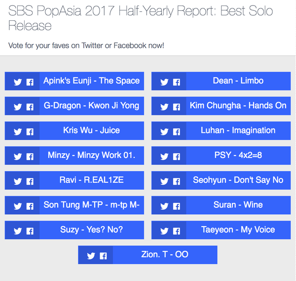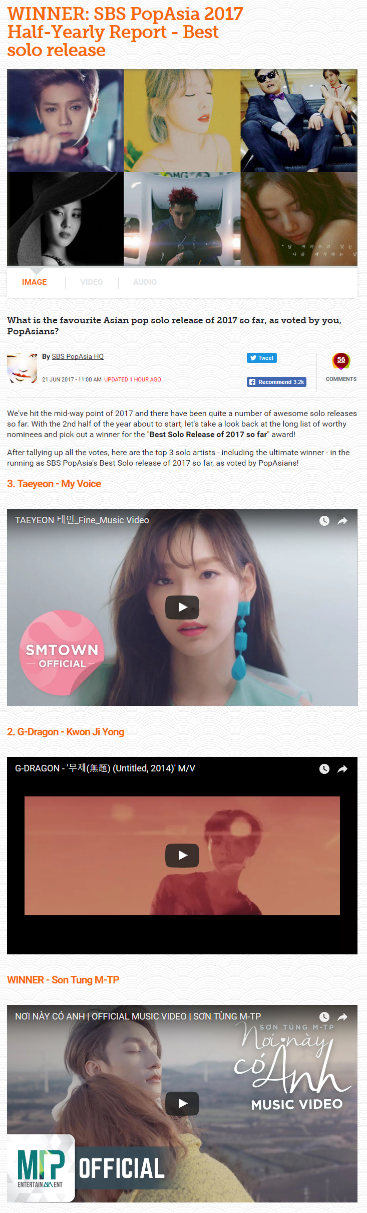 Và theo như thông tin mới nhất, Sơn Tùng đã vừa đánh bại Taeyeon, G-Dragon để giành chiến thắng tại hạng mục Best Solo Release of 2017 (Sản phẩm solo xuất sắc nhất)! Xin được chúc mừng Sơn Tùng cùng các fan của mình.
