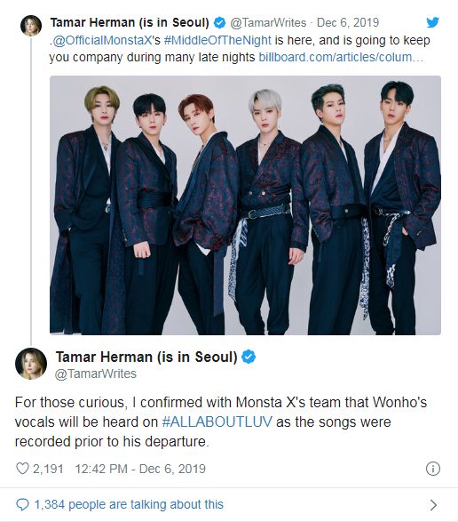 Cụ thể MONSTA X đã phát hành ca khúc mới nhất của mình MIDDLE OF THE NIGHT vào ngày 6/12. Ca khúc sẽ có mặt trong album tiếng Anh sắp tới của nhóm mang tên ALL ABOUT LUV. Điều đặc biệt là album này đã được các chàng trai thực hiện từ trước khi Wonho rời nhóm.