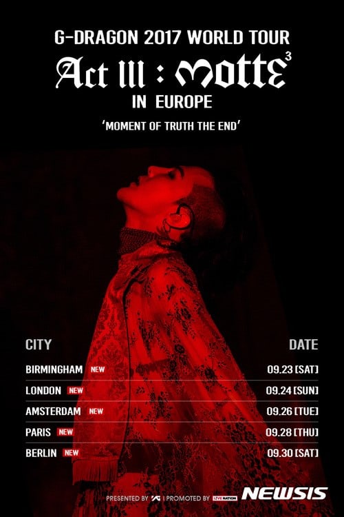 Mới đây, YG Entertainment đã bổ sung 5 điểm dừng chân cho ACT III, M.O.T.T.E - Tour diễn solo của G-Dragon. Cụ thể, đó là các thành phố lớn ở châu Âu như: Birmingham, London (Vương quốc Anh), Amsterdam (Hà Lan), Paris (Pháp) và Berlin (Đức).