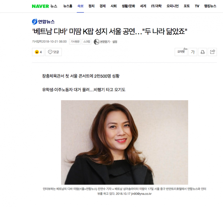 Bài báo của tờ Yonhap News đưa thông tin về đêm nhạc của Mỹ Tâm.