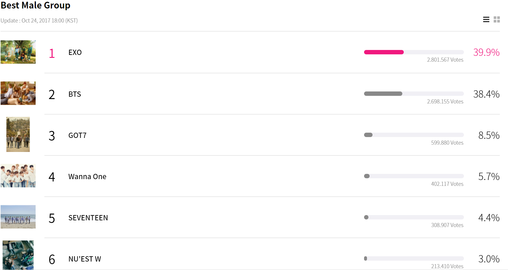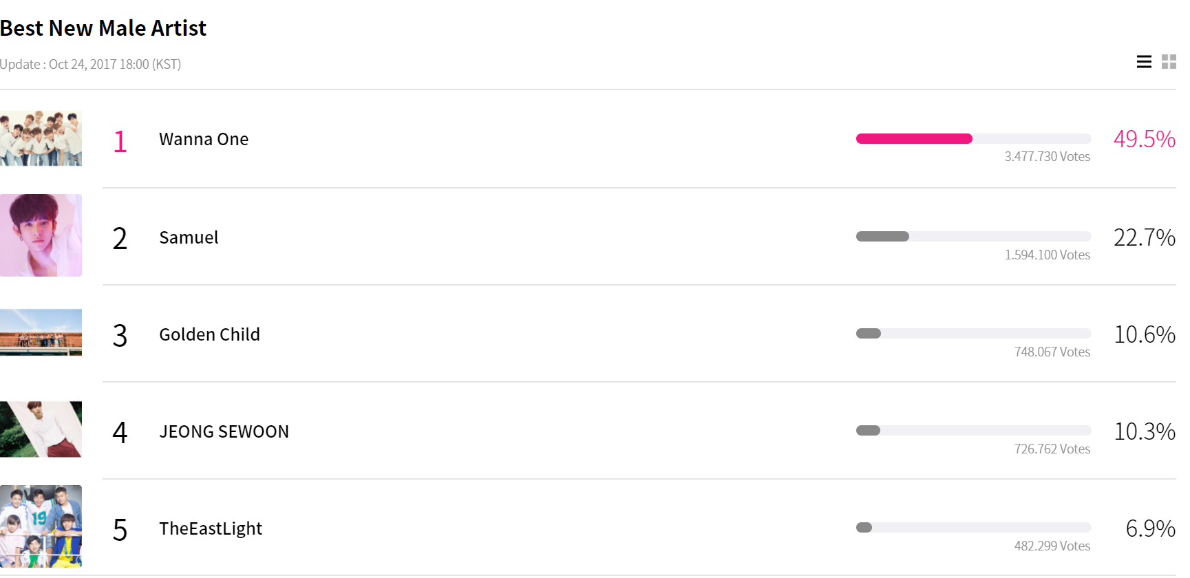 Tân binh siêu hot Wanna One đang dẫn đầu hạng mục Nam Nghệ sĩ mới xuất sắc nhất với 49,5% phiếu bầu, bỏ xa các đối thủ khác.