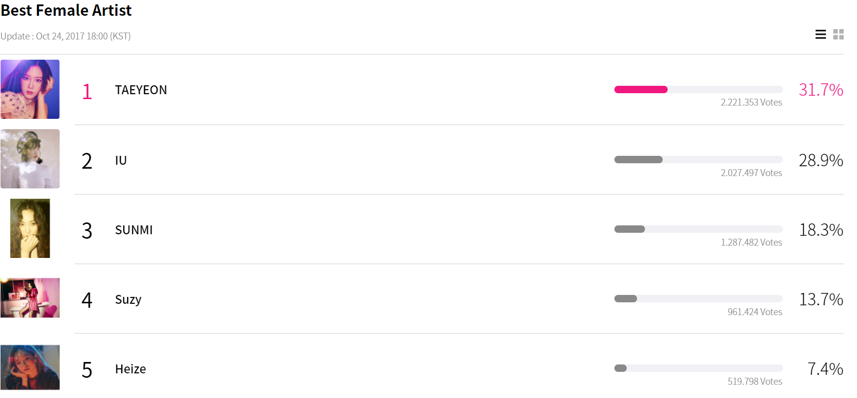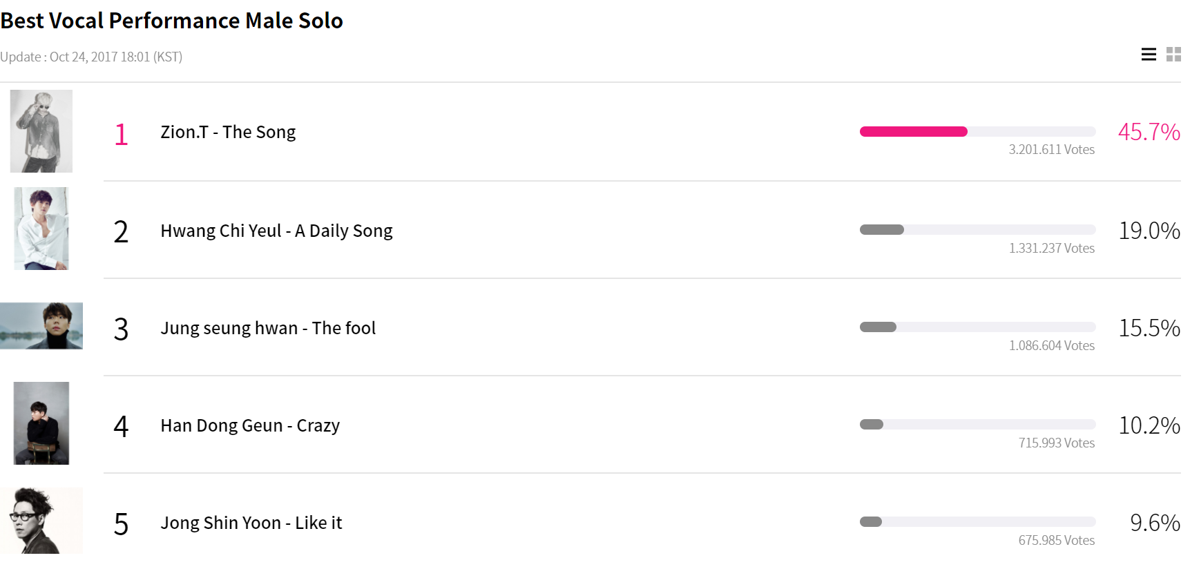 Vào lúc 15h ngày 19/10, danh sách đề cử của giải MAMA 2017 đã được công khai và cổng bình chọn chính thức cũng đã được khởi động vào 16h cùng ngày. Qua hơn 5 ngày, đã có hàng triệu lượt vote cho các nghệ sĩ và cuộc chiến năm nay được dự đoán sẽ khốc liệt hơn những năm trước. Hiện tại, nhiều vị trí trong các hạng mục đề cử chỉ còn là cuộc đua giữa 2 cái tên đầu bảng.