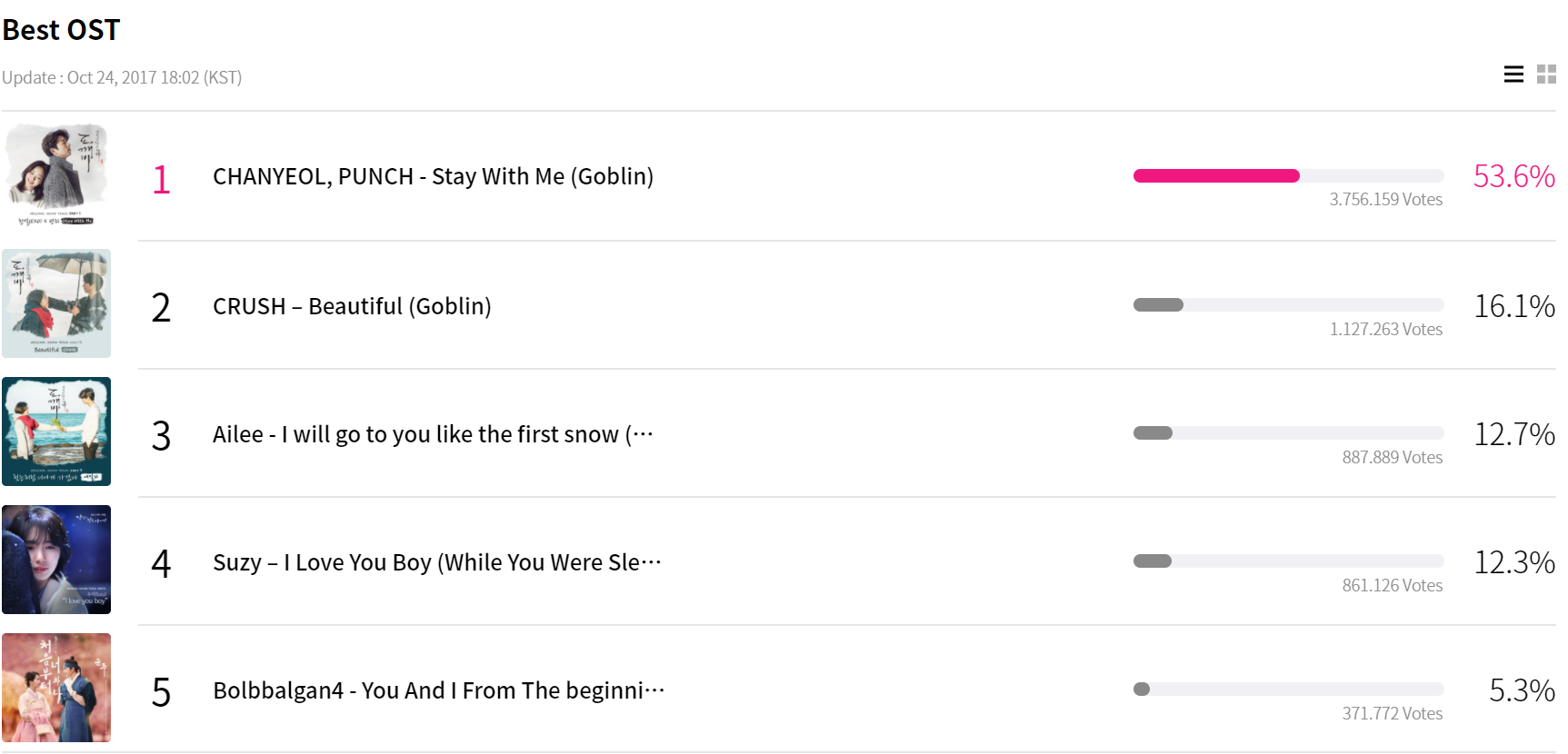 Không nằm ngoài dự đoán, cả 3 bản OST của drama hot nhất năm - Goblin đã “chễm chệ” 3 vị trí đầu bảng và chủ nhân của giải OST xuất sắc nhất chắc chắn sẽ thuộc về ca khúc chủ đề của Gobin - Stay With Me.