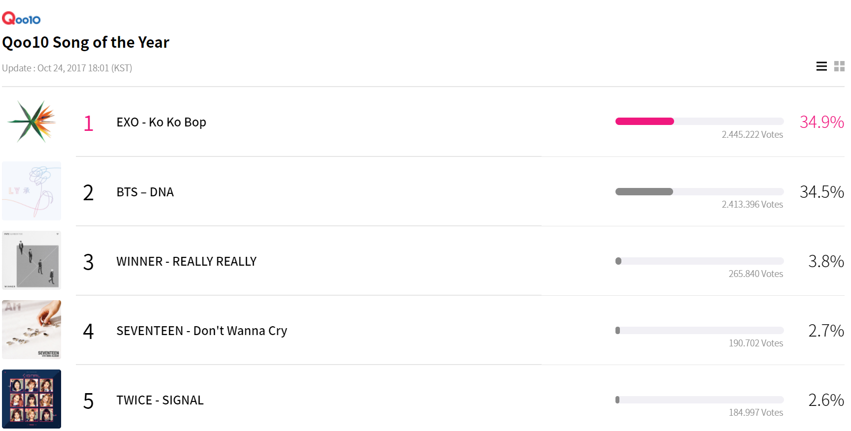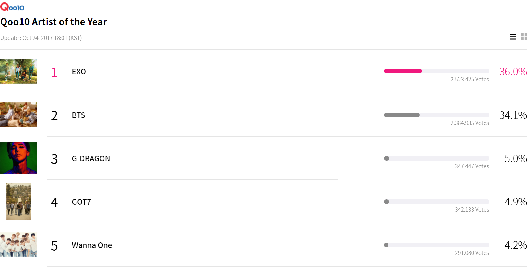 2 vị trí đầu bảng của hạng mục Nghệ sĩ của năm là EXO và BTS hoàn toàn bỏ xa các đối thủ còn lại.