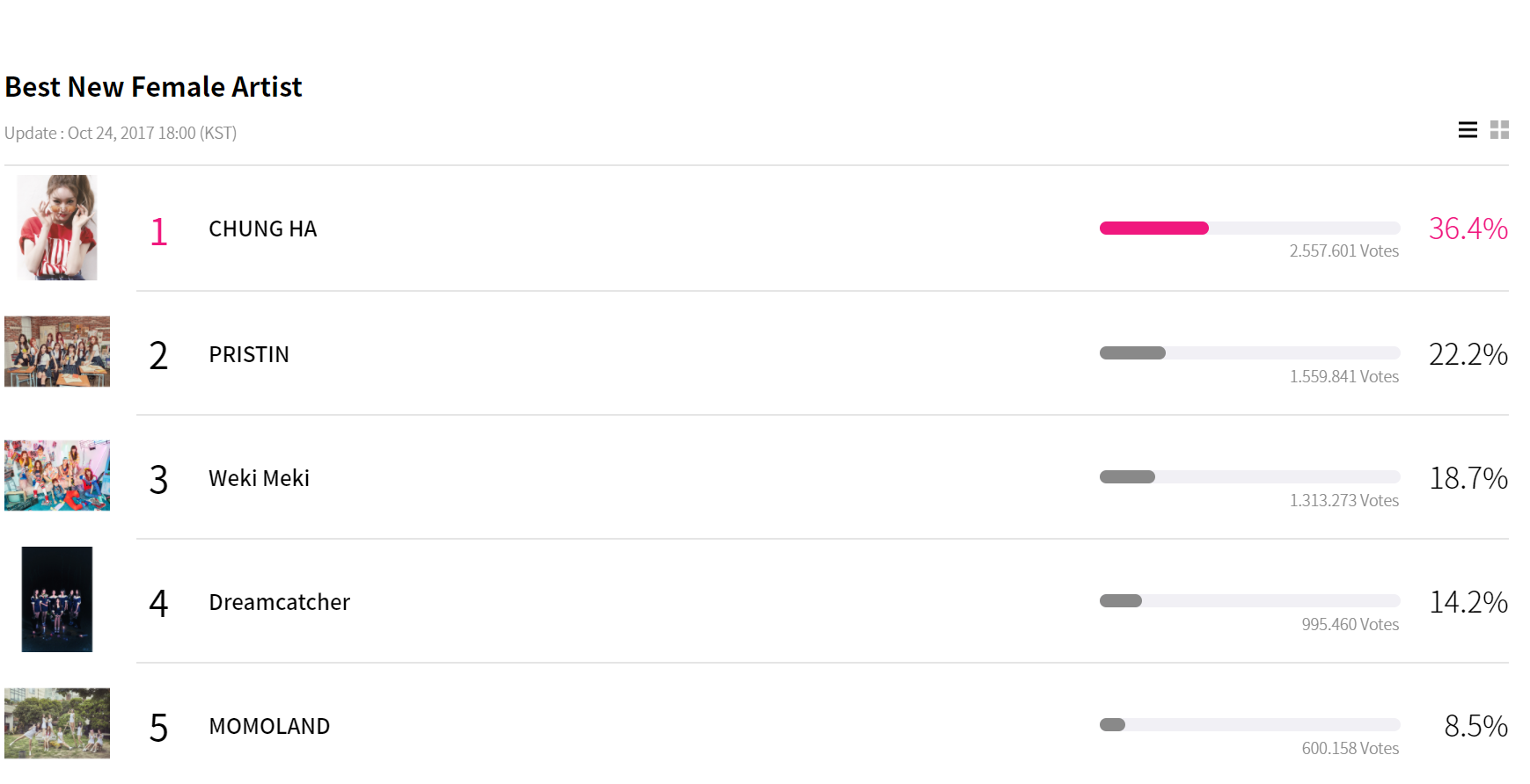 Dù chỉ một thân một mình, Chungha vẫn tự tin dẫn đầu hạng mục Nữ Nghệ sĩ mới xuất sắc nhất, vượt mặt các nhóm nhạc mới khá “ảm đạm” trong đề cử.