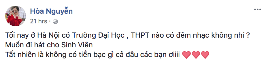Ở độ tuổi “xì teen” của mình, Hoà Minzy vốn nổi tiếng với những phát ngôn bá đạo, hành động “điên rồ” nhưng vô cùng đáng yêu, hài hước. Bên cạnh đó, cô còn vô cùng đam mê ca hát và luôn mong muốn mang tiếng ca lan rộng đến công chúng. Thế nhưng, yêu nghề và nhiệt tình đến mức ngẫu hứng đăng đàn xin được hát miễn phí cho sinh viên trên trang facebook cá nhân thì đúng là showbiz Việt có một không hai “thánh lầy” này.
