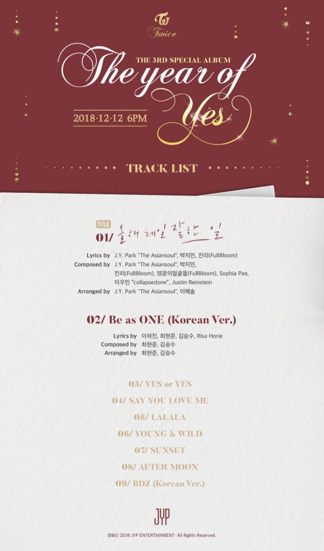 Trước đó vào ngày 4/12, JYP cũng hé lộ tracklist album của TWICE. Cụ thể, sản phẩm trở lại sẽ gồm 9 ca khúc bao gồm Yes or Yes và bài hát chủ đề The Best Thing I Ever Did. Album sẽ được chính thức giới thiệu đến khán giả vào ngày 12/12 tới đây. Được biết, TWICE sẽ không tham gia các hoạt động quảng bá sau khi album phát hành, The year of Yes sẽ là món quà Giáng sinh đúng nghĩa mà các cô gái mong muốn dành tặng cho người hâm mộ của mình. Cùng chờ đợi sản phẩm cuối cùng của TWICE trong năm 2018 này nhé.
