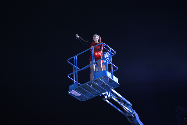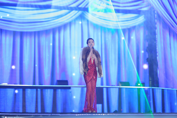 Thu Minh vừa cất cao giọng hát vừa di chuyển trên cao…