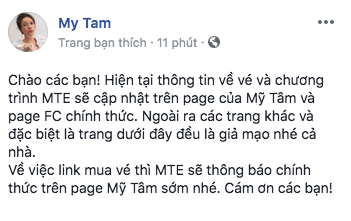 Tuy nhiên, sau đúng 1 ngày thông tin được truyền đi nhanh chóng thì cũng lập tức xuất hiện fanpage không chính chủ, đưa tin về sự kiện Concert tại Hàn Quốc của “họa mi tóc nâu”. Thậm chí, trang này còn “cả gan” bán vé khiến nhiều khán giả hoang mang. Mỹ Tâm đã lập tức đăng đàn thông báo về sự giả mạo này.