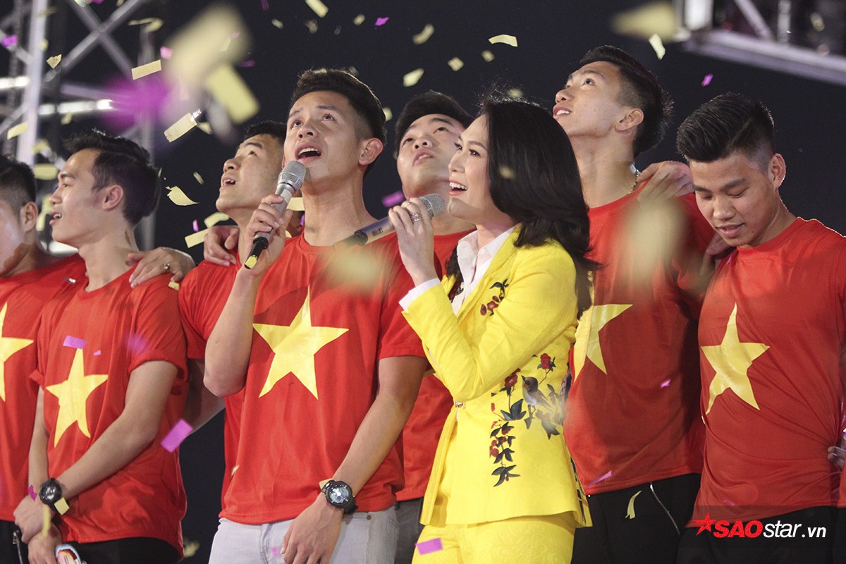 Không thể không nhắc đến chính là Niềm tin chiến thắng - sân khấu đáng mong chờ của Mỹ Tâm và các chàng trai U23 khiến người hâm mộ “rần rần” nhiều ngày qua. Đúng như kỳ vọng, màn trình diễn đầy cảm xúc từ Họa mi tóc nâu cùng Hồng Duy và cả đội U23 đã khiến người xem xúc động.