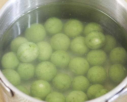 - Sau đó xả sạch lại với nước. Đun sôi 1 nồi nước nóng già, tắt bếp, thả sấu vào chần qua rồi đổ ra rá để thật nguội.