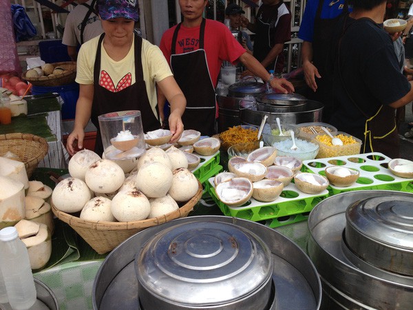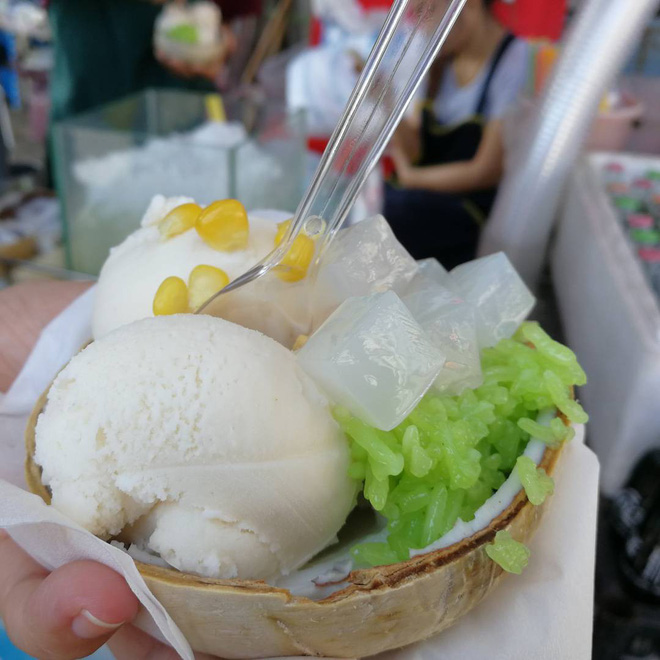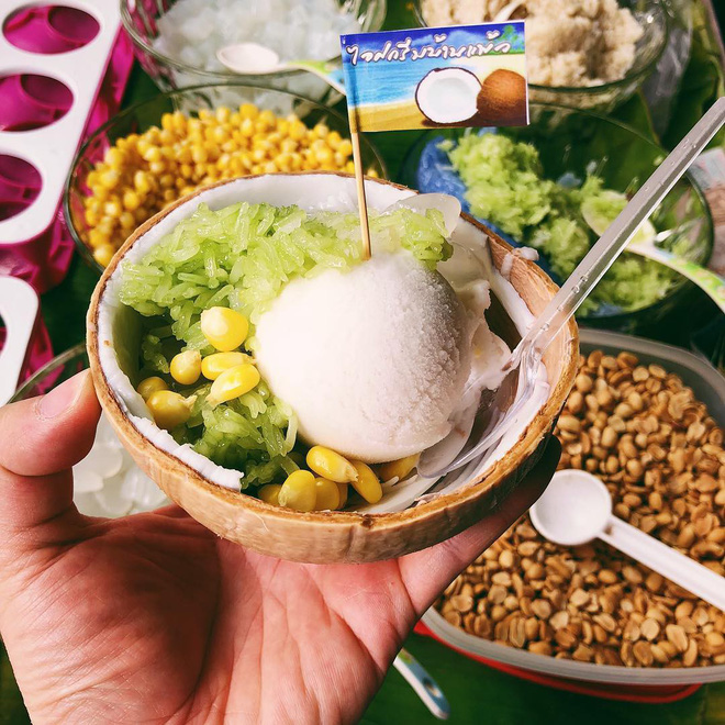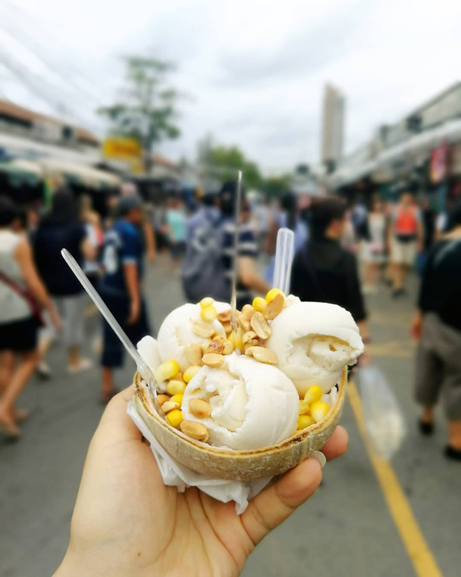 Phải thừa nhận rằng không nơi đâu mà kem dừa lại ngon từ ăn tại Thái Lan. Vị kem ngọt vừa phải, ngậy béo mùi sữa và thơm bùi vị dừa. Dưới thời tiết nắng nóng tại các khu chợ ở Bangkok mà được thưởng thức một trái kem dừa thì mọi cảm giác oi bức đều tiêu tan. Giá một cốc kem dừa khoảng 30 đến 40 ngàn, nhưng bạn sẽ được 1 viên kem to bự với rất nhiều đồ ăn kèm vô cùng ngon miệng.