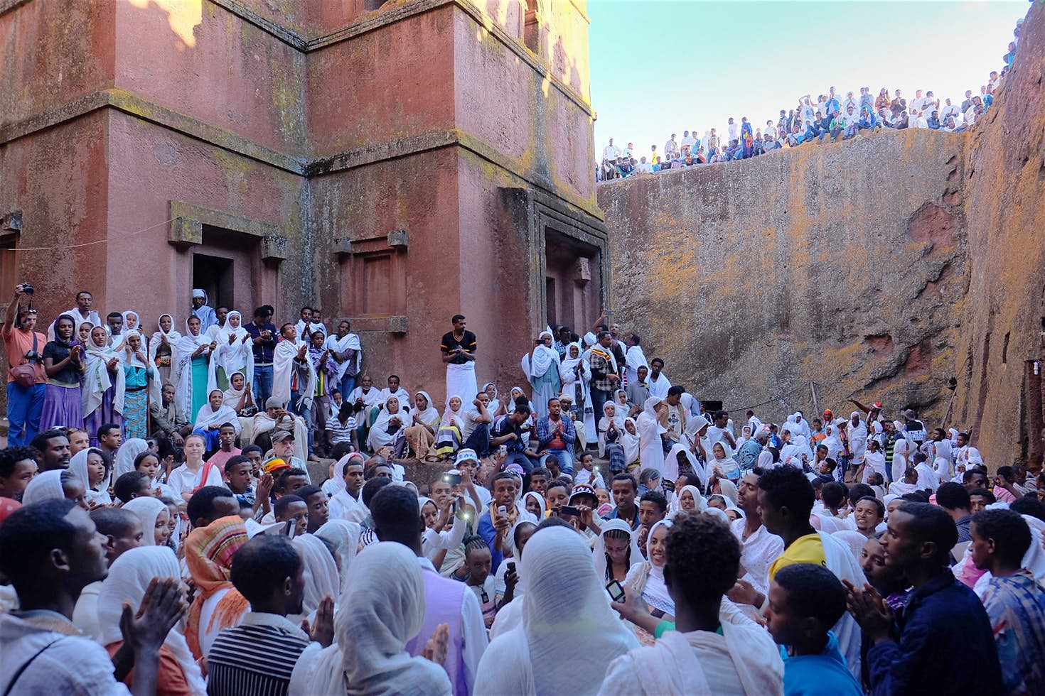 Vị linh mục đại diện nhà thờ St Michael sẽ đội hòm giao ước khắc 10 điều răn trong Kinh thánh và diễu hành trên phố, các linh mục còn lại tay cầm lư hương. Trong khi các linh mục khoác lên mình bộ áo lễ satin hoặc áo nhung với đủ loại màu sắc rực rỡ, người dân Ethiopia lại chân chất trong bộ trang phục truyền thống trắng tinh, cầm những chiếc ô nhung được đính kim tuyến lấp lánh. Nhiều con chiên ở vùng khác cũng hành hương tới Ethiopia, cùng nhau thắp nến cầu nguyện và tẩy trần trong hồ Fasilides.