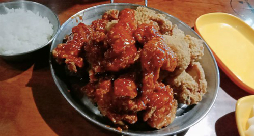 Thịt gà ở Hàn Quốc được chế biến thành món ăn có nhiều hương vị khác biệt như gà tuyết (ăn với phomat), gà yangynum, hay nhiều món rán hấp dẫn khác. Một phần gà ăn thỏa thích (trong hình) ở Seoul có giá khoảng 16.000 won (hơn 330.000 đồng). Ngoài mua ăn trên phố hay ở nhà hàng, thực khách có thể gọi suất gà yangnyum giá 18.000 won (380.000 đồng) được đóng gói như pizza đi kèm nước uống hoặc kem. Ảnh: Asiaone.