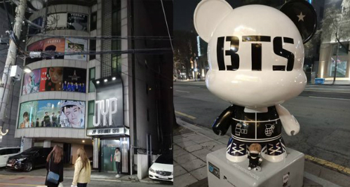 Ngoài sở hữu tượng gấu biểu trưng, Gangnam còn là thiên đường của các fan nhạc Kpop khi các trụ sở công ty giải trí đều ở quanh khu vực này. Nhiều địa điểm ở đây giúp fan có thể bắt gặp thần tượng của mình ví như quán cà phê trước cửa tòa nhà công ty giải trí JYP.