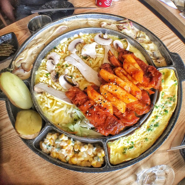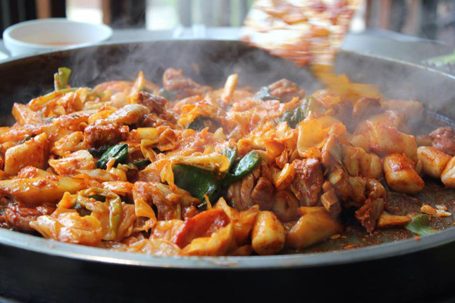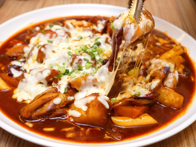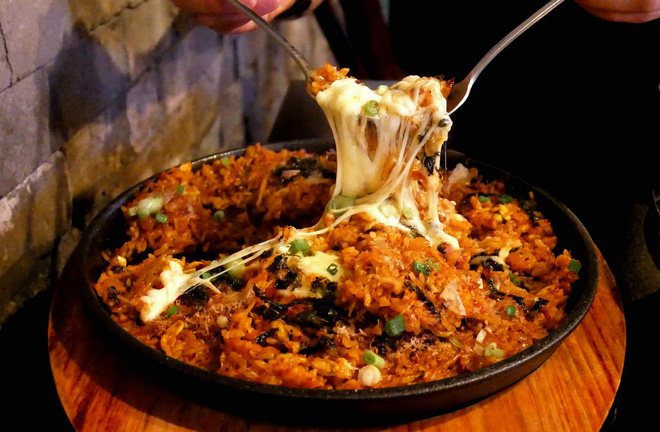 Được phục vụ ngay trên chảo nóng, món cơm rang phô mai này tưởng chừng không có gì đặc biệt lại chinh phục được ngay cả những thực khách khó tính nhất. Những hạt cơm giòn hòa với phô mai dai mềm, béo ngậy, được trung hòa bằng kim chi chua cay dễ ăn, tạo ra món ăn có tổng thể không chê vào đâu được.