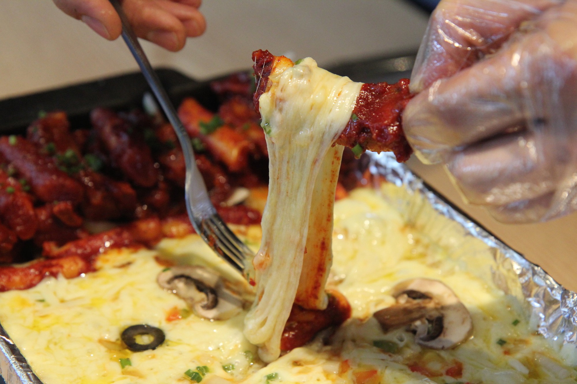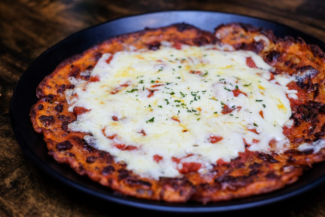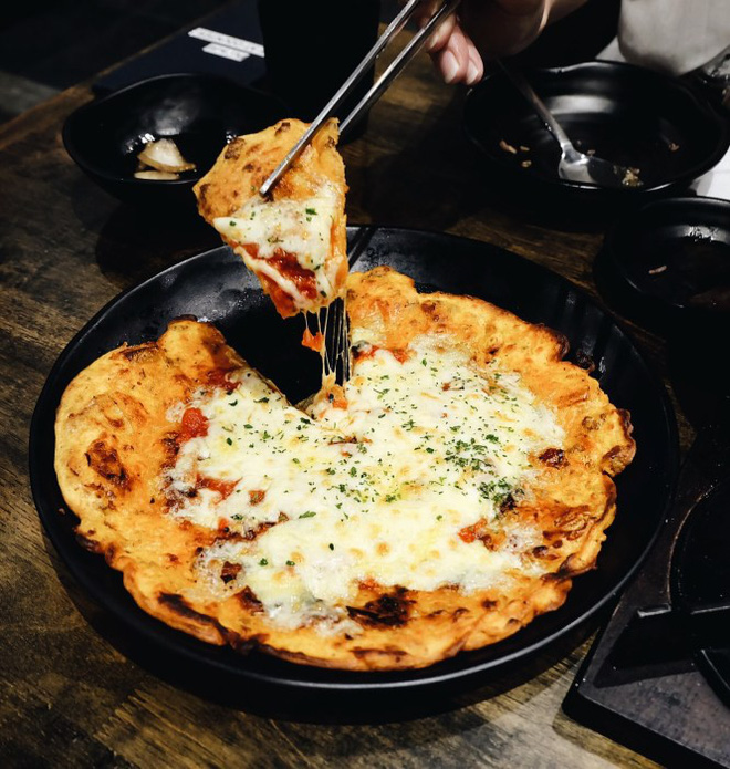 Nếu mê pizza, bạn có thể thử “pizza phiên bản Hàn” được làm từ bột mì, bột gạo, trứng, kim chi và không thể thiếu phô mai. Một số nơi còn cho thêm mực vào bánh. Phần bột giòn kết hợp với kim chi chua cay lạ miệng, phô mai thơm phức và sốt cà chua đậm đà sẽ đem lại cho bạn một trải nghiệm ẩm thực khó quên.
